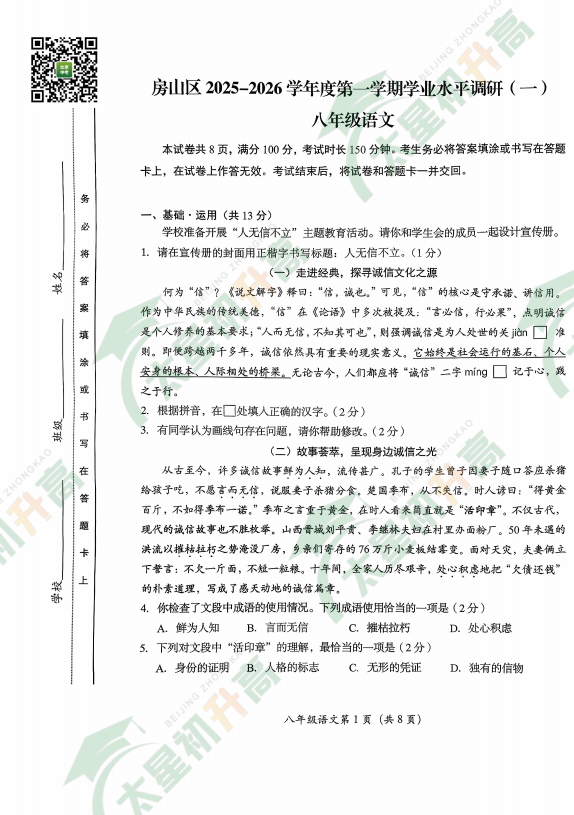 房山区初二年级2025-2026学年度第一学期期中考试语文试卷发布!本文内含房山区初二年级上学期期中考试试卷真题卷完整内容,家长可在文末下载查看。