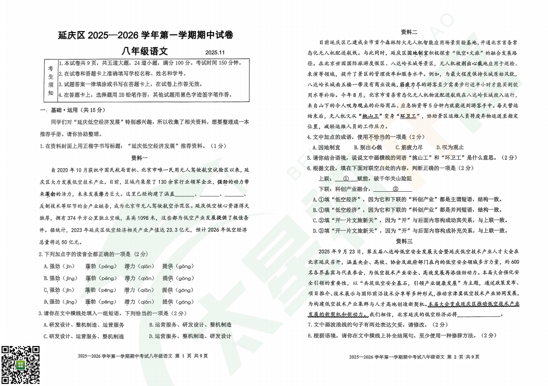 延庆区初二年级2025-2026学年度第一学期期中考试语文试卷发布!本文内含延庆区初二年级上学期期中考试试卷真题卷完整内容,家长可在文末下载查看。