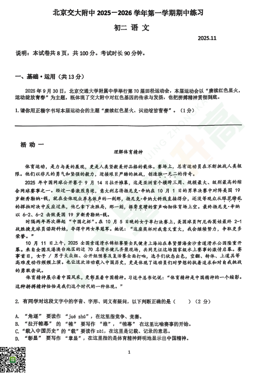 海淀区初二年级2025-2026学年度第一学期期中考试语文试卷发布!本文内含海淀区北京交大附中初二年级上学期期中考试试卷真题卷完整内容,家长可在文末下载查看。
