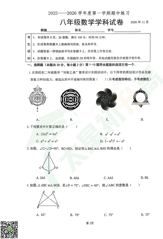 海淀区初二2025-2026学年度上学期期中数学试卷发布!含北大附中真题卷完整内容,家长文末能下载查看。