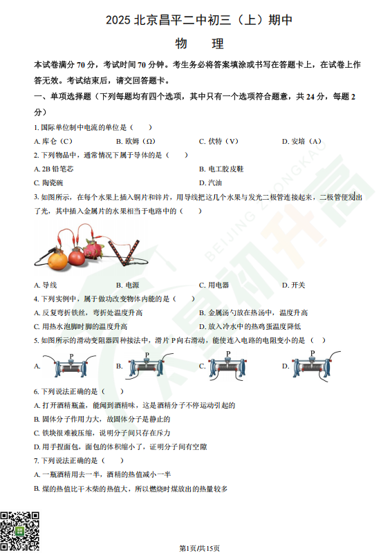 昌平区初三年级2025-2026学年度第一学期期中考试物理试卷发布!本文内含昌平区昌平二中初三年级上学期期中考试试卷真题卷完整内容,家长可在文末下载查看。