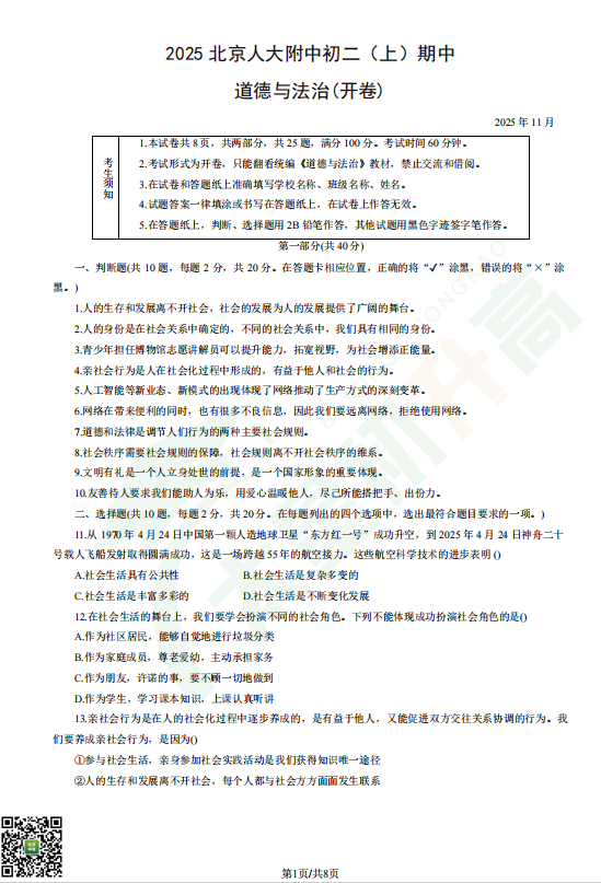 海淀区初二年级2025-2026学年度第一学期期中考试道德与法治试卷发布!本文内含海淀区人大附中初二年级上学期期中考试试卷真题卷完整内容,家长可在文末下载查看。