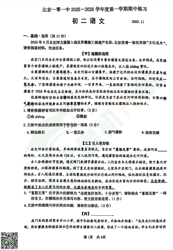 海淀区初二年级2025-2026学年度第一学期期中考试语文试卷发布!本文内含海淀区北京一零一中学初二年级上学期期中考试试卷真题卷完整内容,家长可在文末下载查看。