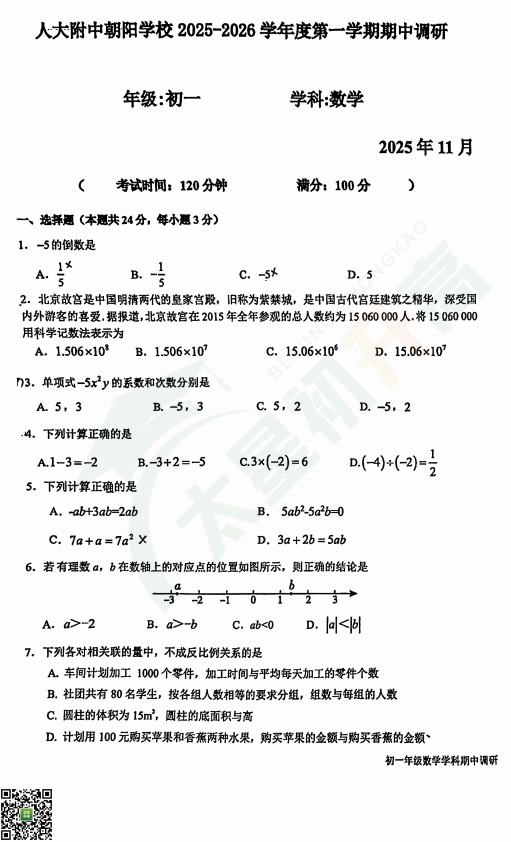 朝阳区初一2025-2026学年度上学期期中数学试卷发布!含人大附中朝阳学校真题卷完整内容,家长文末能下载查看。