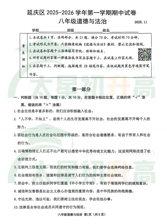 延庆区初二年级2025-2026学年度第一学期期中考试道德与法治试卷发布!本文内含延庆区初二年级上学期期中考试试卷真题卷完整内容,家长可在文末下载查看。