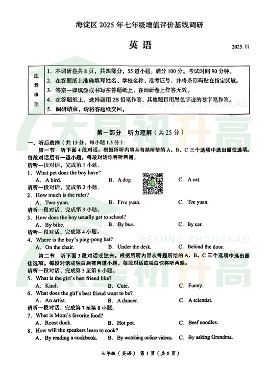海淀区初二年级2025-2026学年度第一学期期中考试英语试卷发布!本文内含海淀区海淀二中初二年级上学期期中考试试卷真题卷完整内容,家长可在文末下载查看。