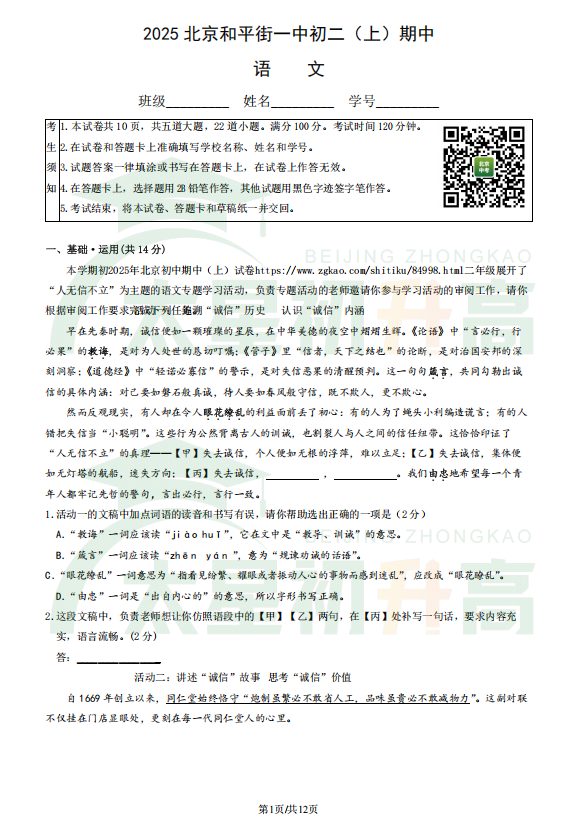 朝阳区初二年级2025-2026学年度第一学期期中考试语文试卷发布!本文内含朝阳区和平街一中初二年级上学期期中考试试卷真题卷完整内容,家长可在文末下载查看。