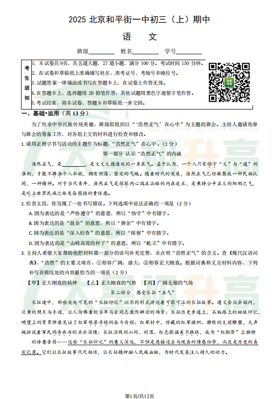 朝阳区初三年级2025-2026学年度第一学期期中考试语文试卷发布!本文内含朝阳区和平街一中初三年级上学期期中考试试卷真题卷完整内容,家长可在文末下载查看。