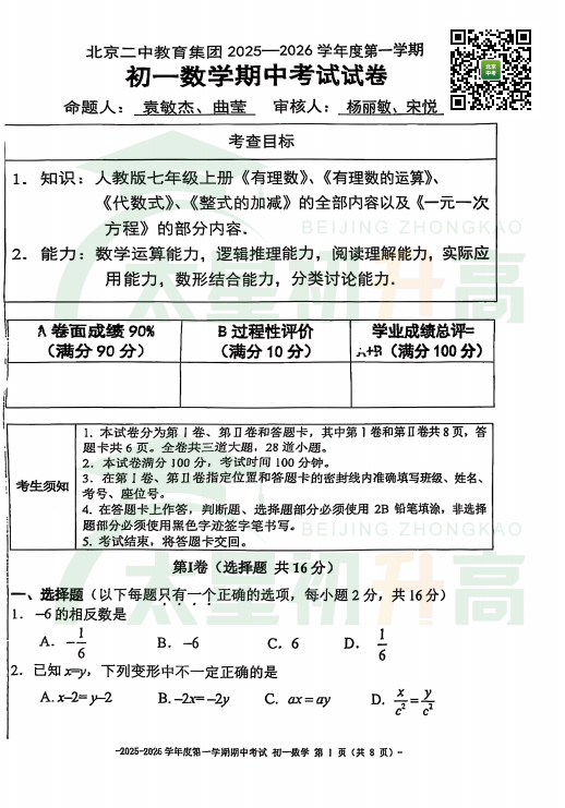 东城区初一2025-2026学年度上学期期中数学试卷发布!含北京二中教育集团真题卷完整内容,家长文末能下载查看。