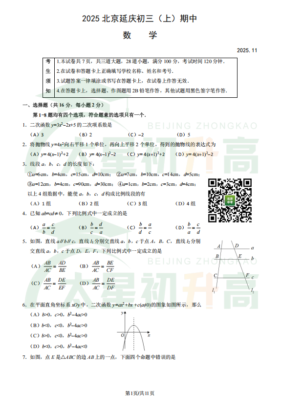 延庆区初三年级2025-2026学年度第一学期期中考试数学试卷发布!本文内含延庆区初三年级上学期期中考试试卷真题卷完整内容,家长可在文末下载查看。