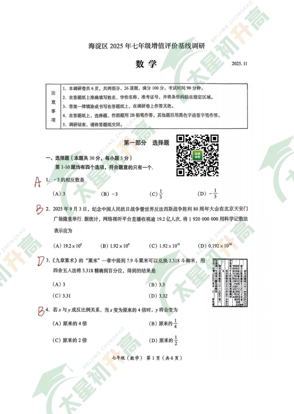 海淀区初一2025-2026学年度上学期期中数学试卷发布!含海淀区真题卷完整内容,家长文末能下载查看。