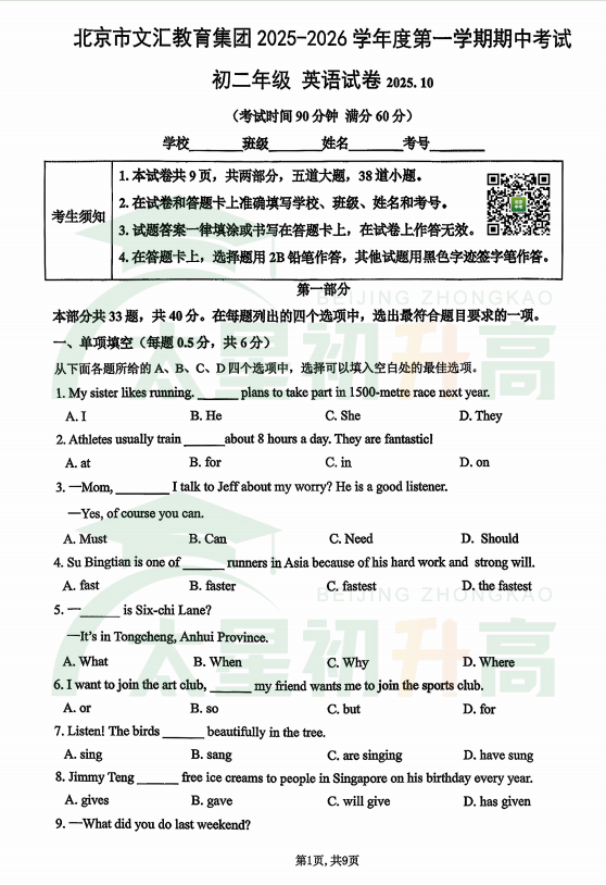 东城区初二年级2025-2026学年度第一学期期中考试英语试卷发布!本文内含东城区北京市文汇教育集团初二年级上学期期中考试试卷真题卷完整内容,家长可在文末下载查看。