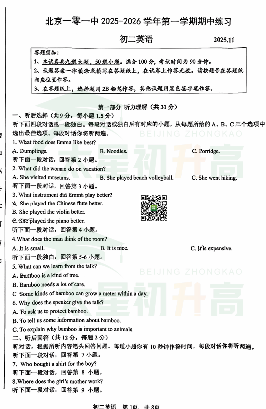 海淀区初二年级2025-2026学年度第一学期期中考试英语试卷发布!本文内含海淀区北京一零一中学初二年级上学期期中考试试卷真题卷完整内容,家长可在文末下载查看。