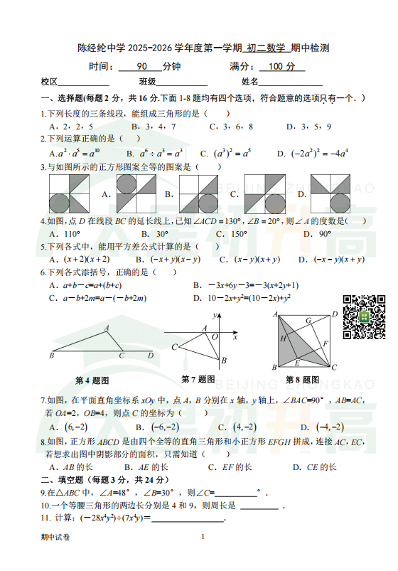 朝阳区初二年级2025-2026学年度第一学期期中考试数学试卷发布!本文内含朝阳区北京陈经纶中学初二年级上学期期中考试试卷真题卷完整内容,家长可在文末下载查看。
