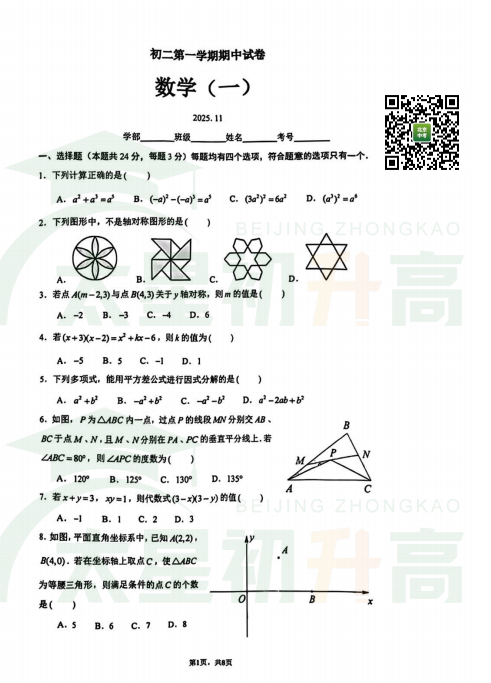 海淀区初二年级2025-2026学年度第一学期期中考试数学试卷发布!本文内含海淀区清华附中初二年级上学期期中考试试卷真题卷完整内容,家长可在文末下载查看。