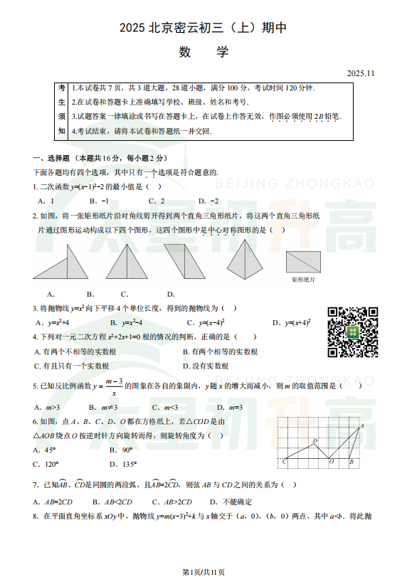 密云区初三年级2025-2026学年度第一学期期中考试数学试卷发布!本文内含密云区初三年级上学期期中考试试卷真题卷完整内容,家长可在文末下载查看。