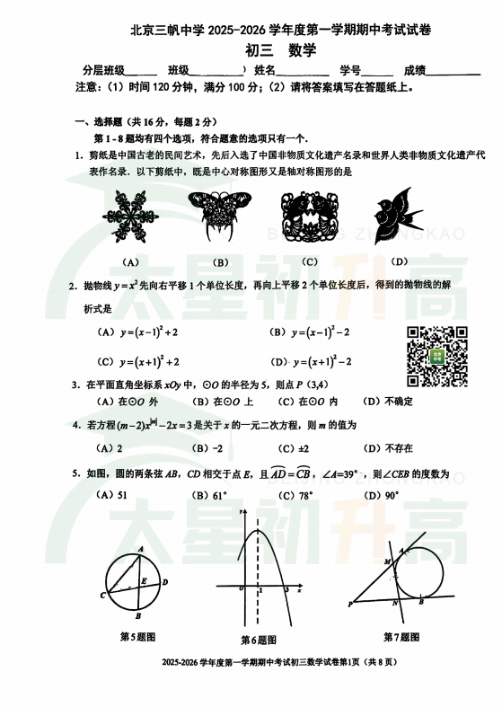 西城区初三年级2025-2026学年度第一学期期中考试数学试卷发布!本文内含西城区北京三帆中学初三年级上学期期中考试试卷真题卷完整内容,家长可在文末下载查看。