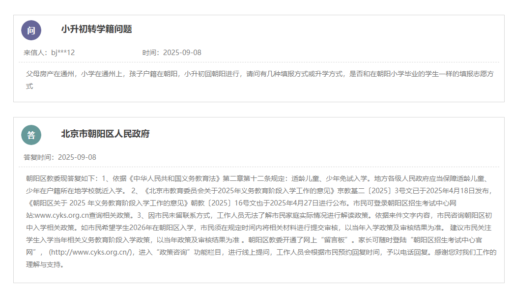 根据朝阳区人民政府答复家长有关转学相关疑问: