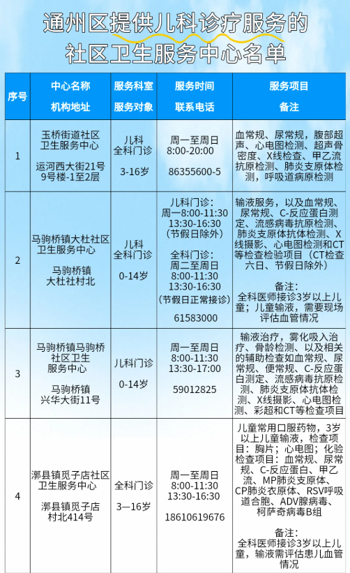 日前,通州区卫健委公布了提供儿科诊疗服务的基层医疗卫生机构名单,共23家社区卫生服务中心: