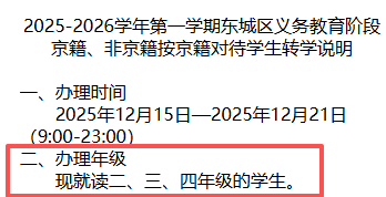 2026年寒假前转学东城区小学申请对象为现就读二、三、四年级的学生: