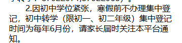 因初中学位紧张,寒假前不办理集中登记,初中转学(限初一、初二年级)集中登记时间为每年6月份。
