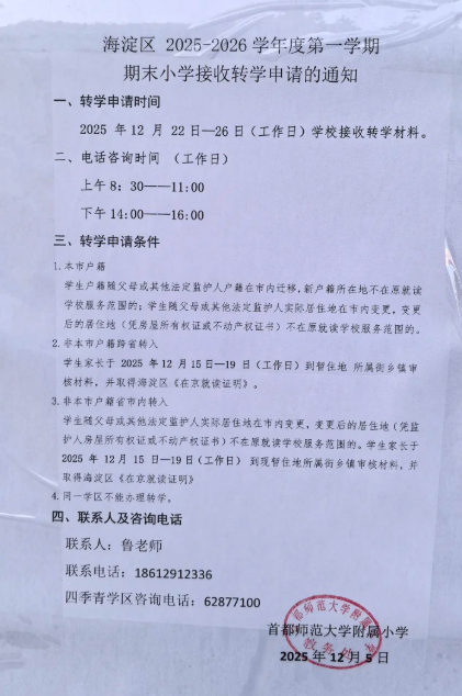 海淀区首都师范大学附属小学2025-2026学年度第一学期期末小学接收转学申请的通知