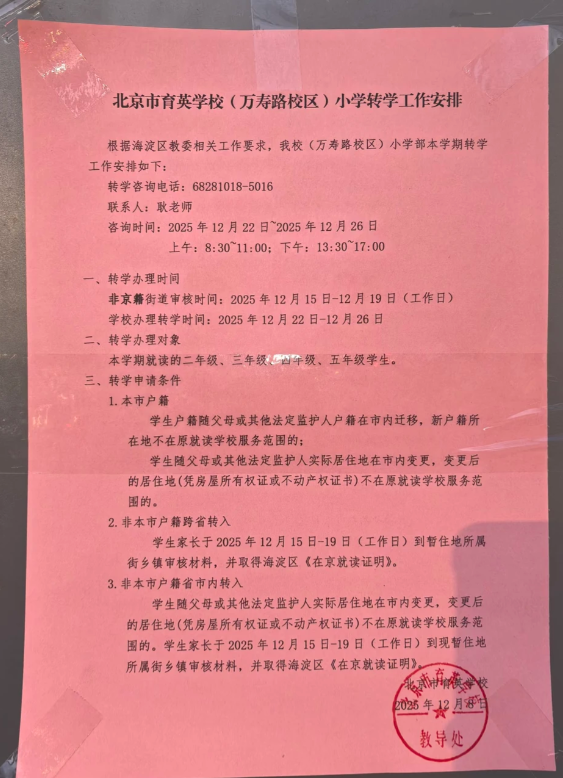 海淀区育英学校(万寿路校区)2025-2026学年度第一学期期末小学转学工作安排