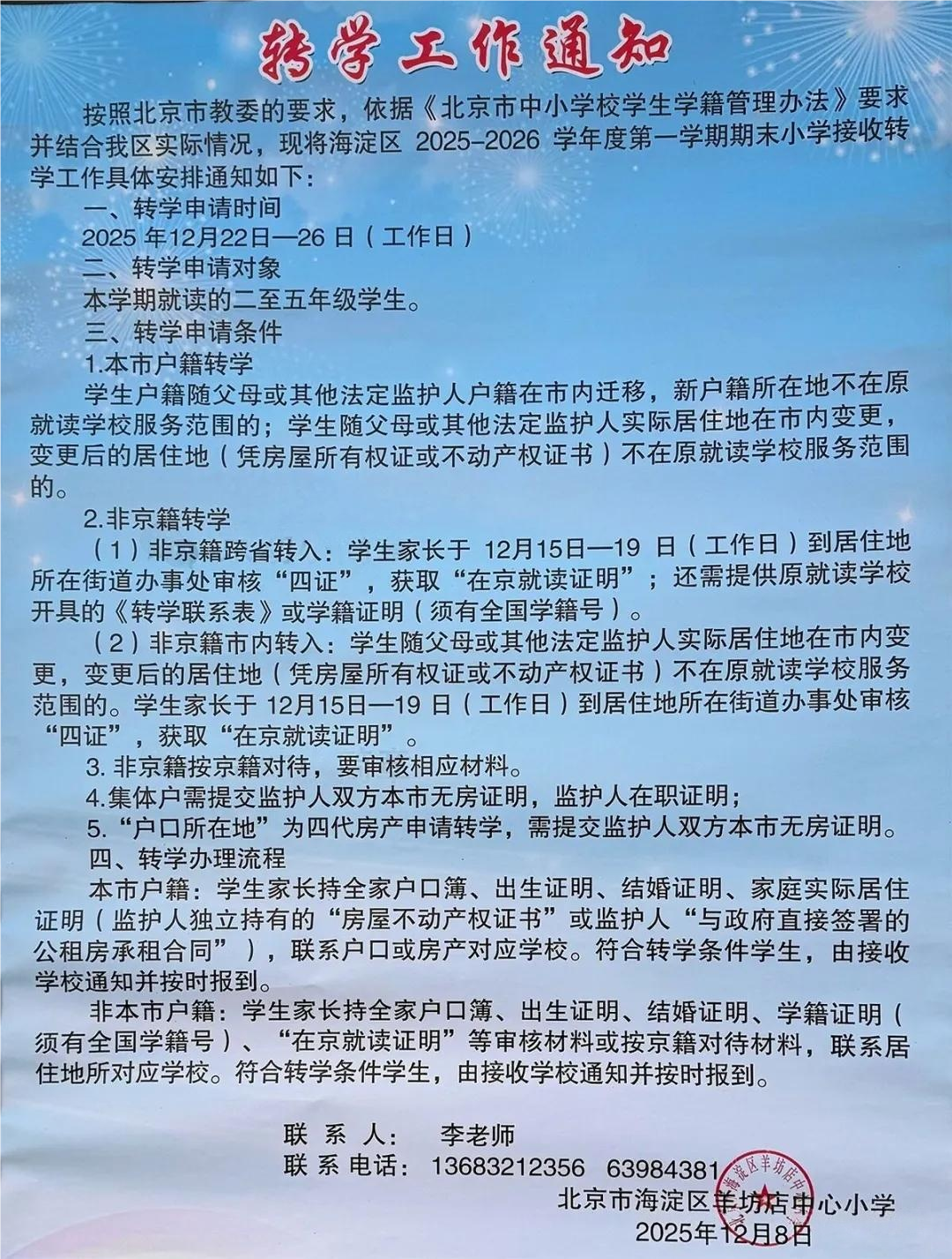 海淀区羊坊店中心小学2025-2026学年第一学期转学工作通知