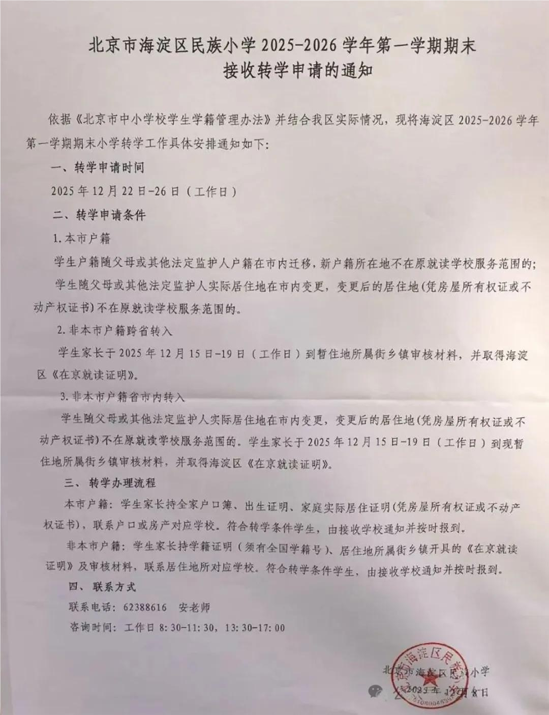 海淀区民族小学2025-2026学年第一学期期末接收转学申请的通知