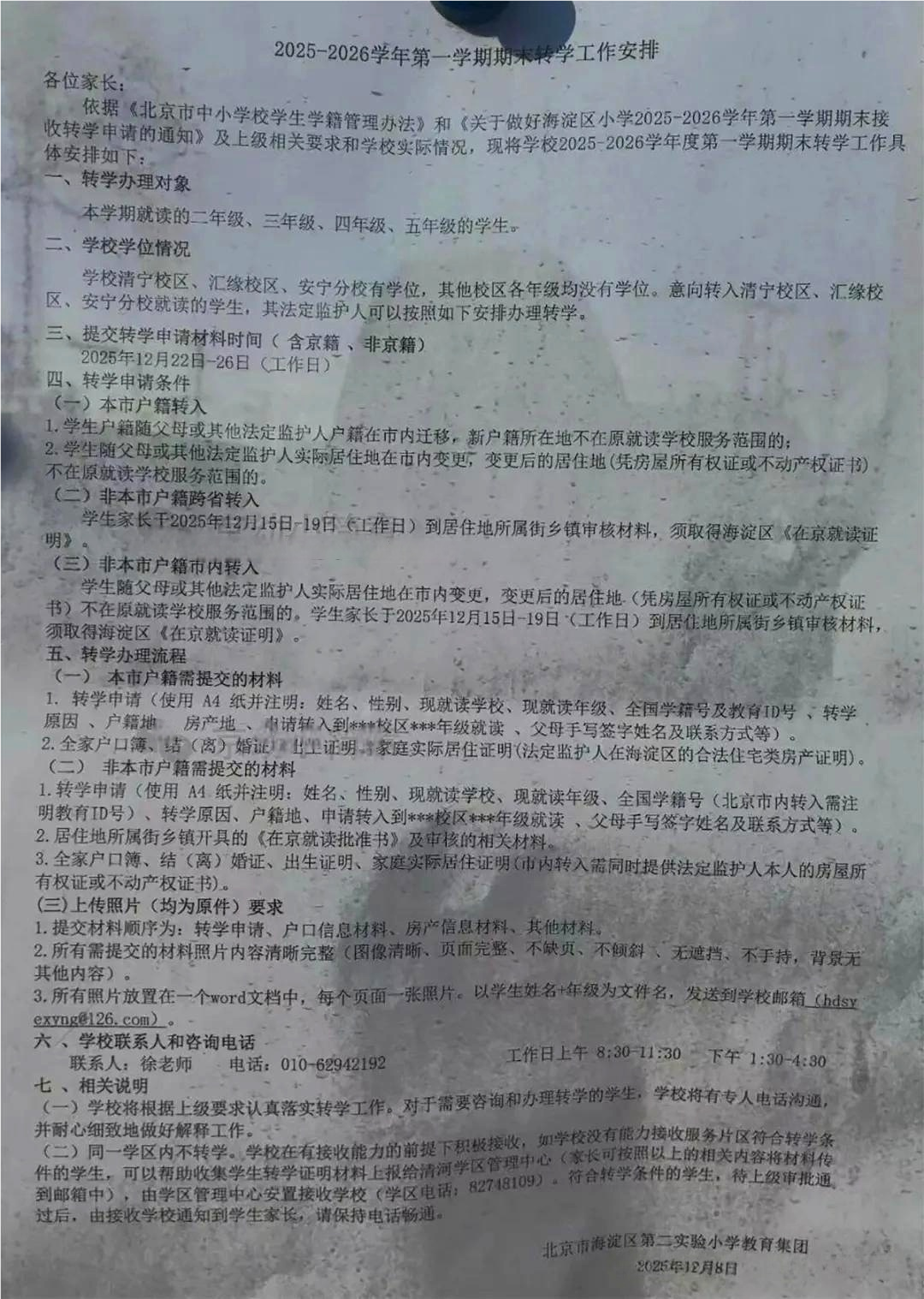 各位家长:依据《北京市中小学校学生学籍管理办法》和《关于做好海淀区小学2025-2026学年第一学期期末接收转学申请的通知》及上级相关要求和学校实际情况,现将学校2025-2026学年度第一学期期末转学工作具体安排如下: