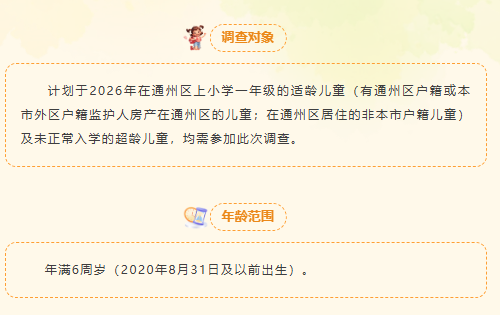 计划于2026年在通州区上小学一年级的适龄儿童(有通州区户籍或本市外区户籍监护人房产在通州区的儿童;在通州区居住的非本市户籍儿童)及未正常入学的超龄儿童,均需参加此次调查。