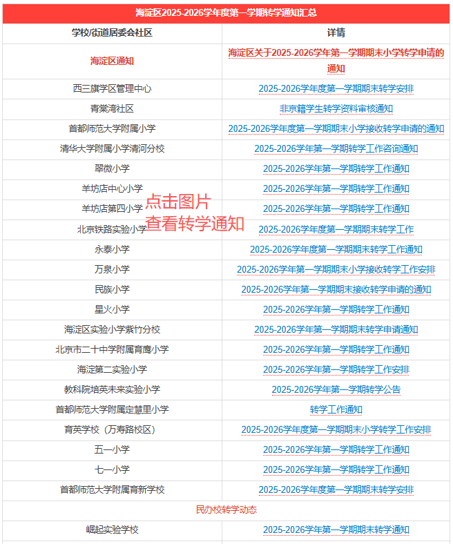 海淀区多所学校已发布转学通知,公办校如八一学校、育英学校(万寿路校区)、羊坊店小学、首师大实验小学等;民办校如锦秋学校、人北实验学校等。