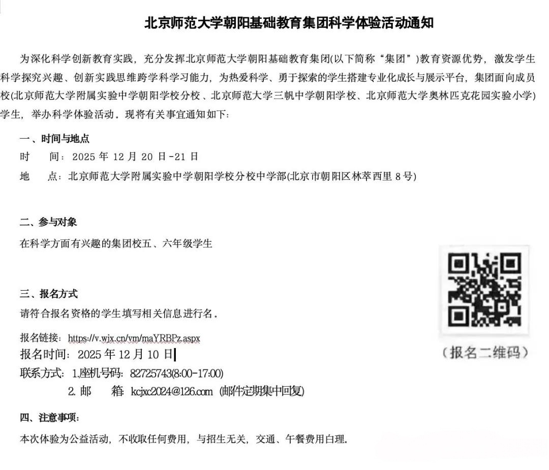 为深化科学创新教育实践,充分发挥北京师范大学朝阳基础教育集闭(以下简称“集团”)教育资源优势,激发学生科学探究兴趣、创新实践思维跨学科学习能力,为热爱科学、勇于探索的学生搭建专业化成长与展示平台,集团面向成员校(北京师范大学附属实验中学朝阳学校分校、北京师范大学三帆中学朝阳学校、北京师范大学奥林匹克花园实验小学学生,举办科学体验活动,现将有关事宜通知如下: