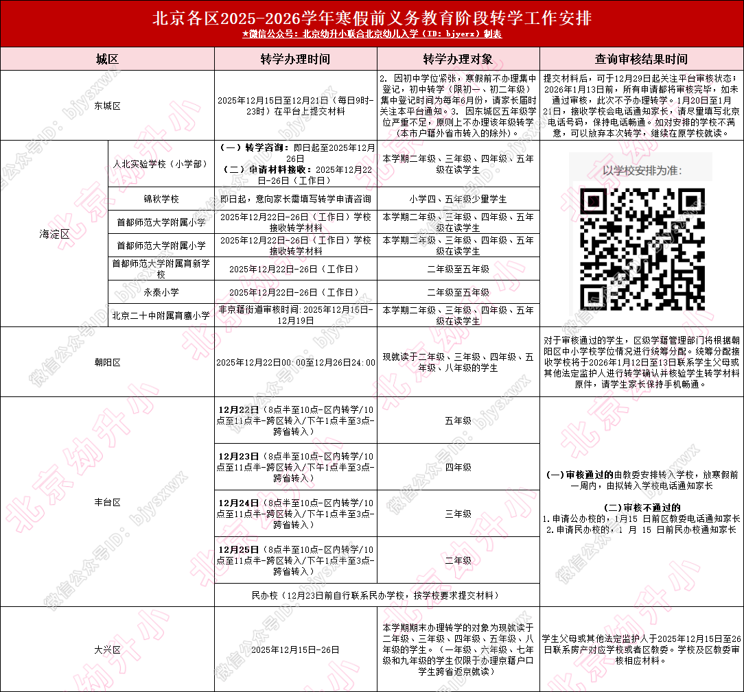 提醒:除上述城区外,参考往年多区或将发布转学通知,详情可关注北京市各区中小学义务教育2025-2026学年度寒假前转学信息汇总(转学通知、材料、方式、流程等)