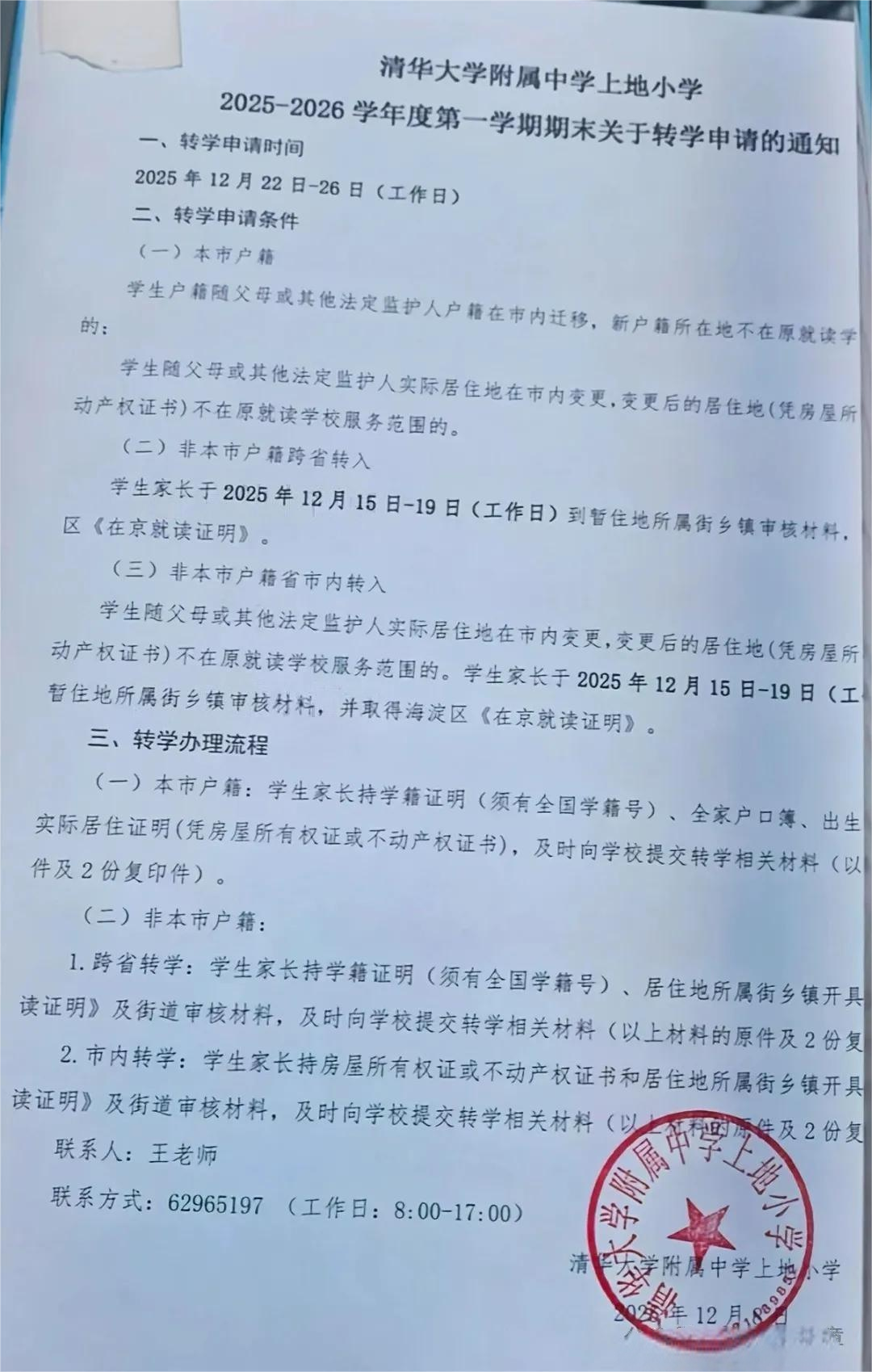 海淀区清华大学附属中学上地小学2025-2026学年第一学期转学工作咨询通知