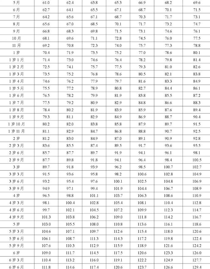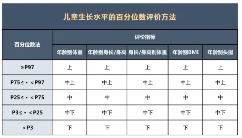 家长可对照以下体重、身高等各项具体指标,根据孩子的实际情况查看对照的百分位数值,最后将数值代入上表进行孩子生长水平判断。