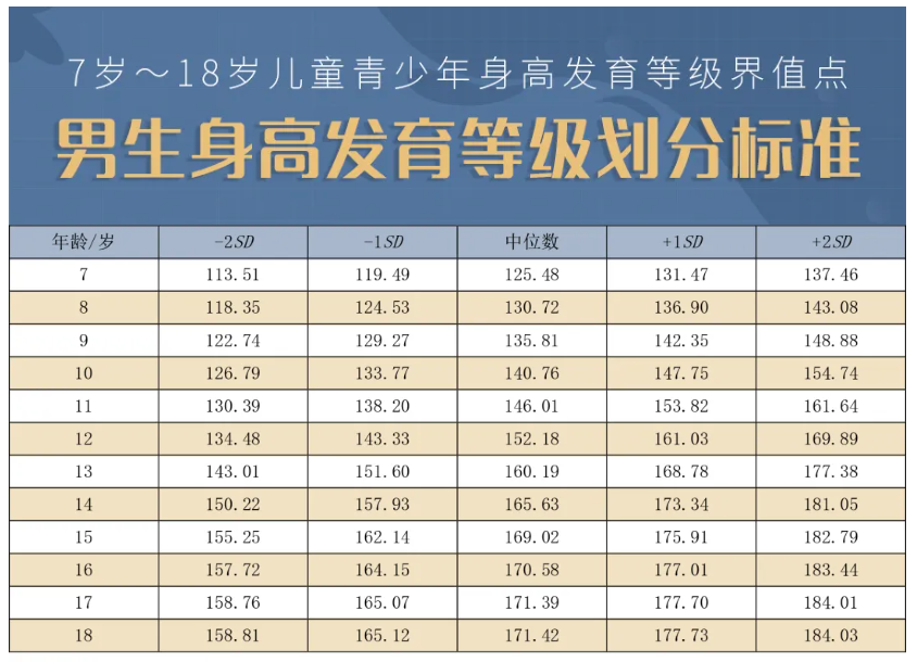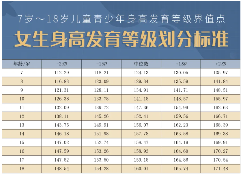 如果孩子大于7 岁,则可参考《7 岁~18 岁儿童青少年身高发育等级评价》。其中,将孩子的身高发育分成了5个等级: