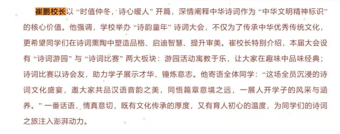 2月23日上午,人大附中北京经济技术开发区学校第八届“诗韵童年”诗词大会启动仪式如约启幕。新任校长崔鹏以“时值仲冬,诗心暖人”为题开场,深刻解读中华诗词作为“中华文明精神标识”的核心要义。这也意味着,这所扎根南城的万人大校,迎来了新书记与新校长的全新领导班子——人大附中此次共选派三位核心干部进驻该校任职。