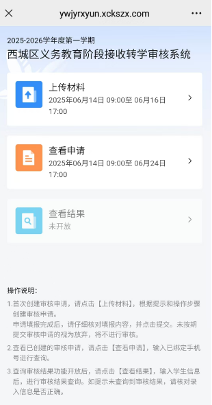 西城区2025-2026学年度第二学期义务教育阶段公办学校转学要求汇总,西城区2025-2026学年度第二学期义务教育阶段转学审核系统,支持线上申请、材料上传与实时审核,家长学生可随时随地查询办理进度,家长请按时收藏办理。