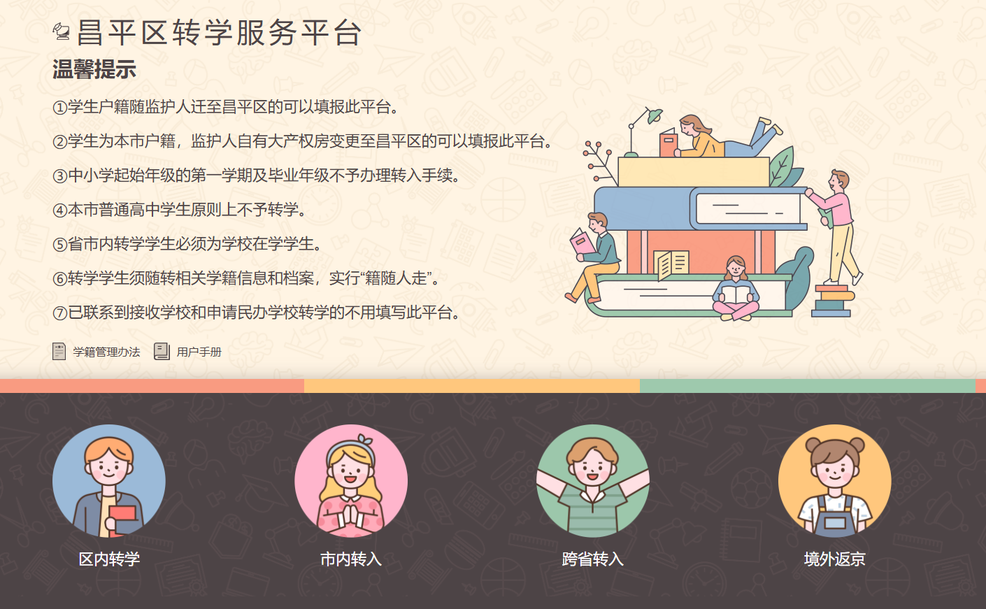 昌平区2025-2026学一年第期小学初中转学要求汇总,其中昌平区2025-2026学年第一学期转学服务平台,家长可在线申请、材料提交、进度查询等让学生家长轻松完成转学手续。