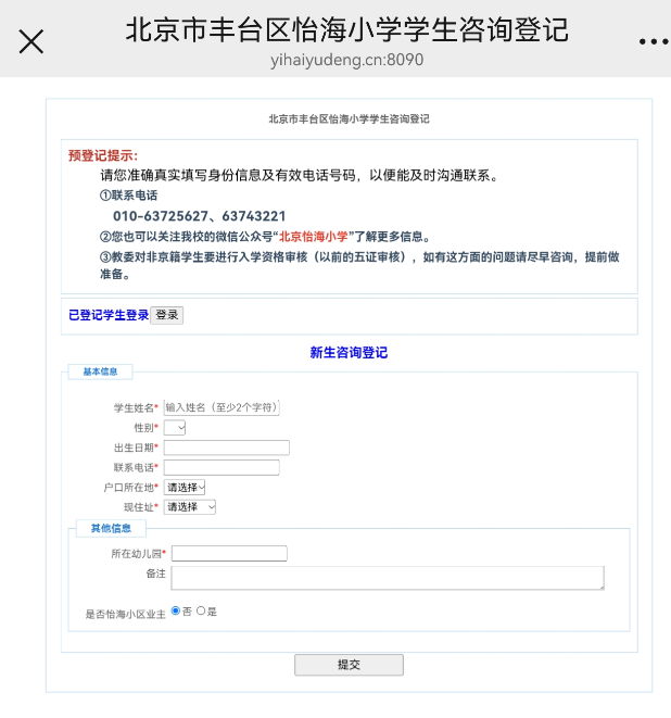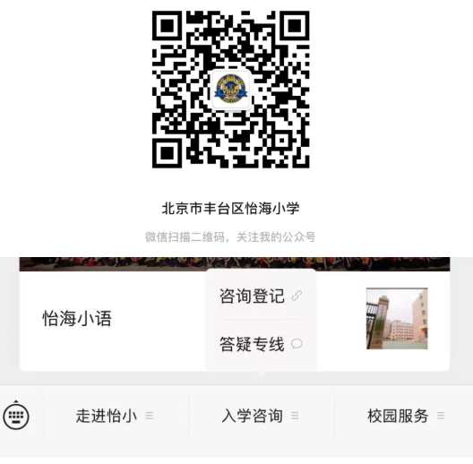 2.扫描关注北京市丰台区怡海小学公众号,点击本公众号底部菜单栏入学咨询-咨询登记,跳转至登记系统完成填报。