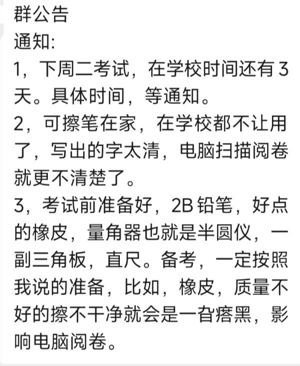 2026年1月13日-15日进行期末考试,我们是小学三年级的。三年级也算是真正意义上的一次考试,北京一二年级是乐考。 现在老师的通知写的真的非常仔细,认证负责的态度没得说。孩子们真的是该从小养成这样的好习惯,尤其是写字和涂卡,这个事情看着简单,实际上做不好非常影响考试分数的。