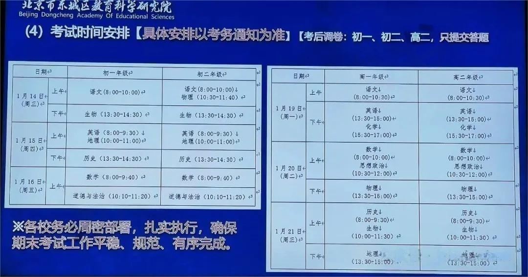 根据东城区安排,初一初二年级在1月14日-16日,高一高二年级在1月19日-21日进行期末考试: