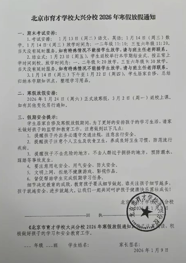 2、2026年北京各中小学期末考试时间、寒假放假、开学返校通知持续更新!家长可收藏本文,方便了解北京小学生动态。