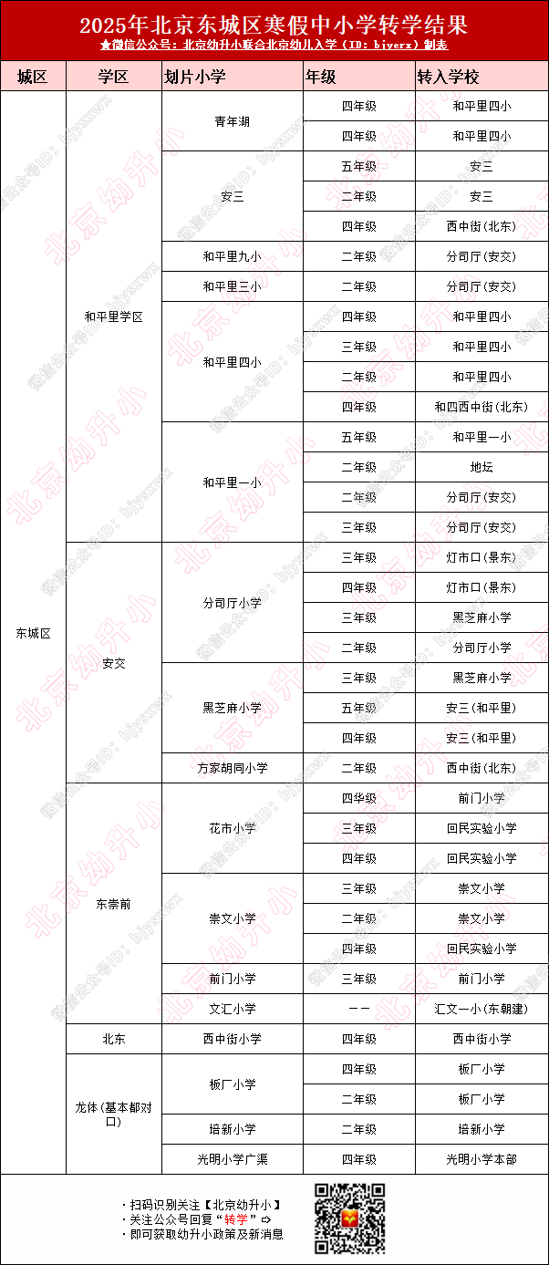 东城区2026年小学结果将在1月20日、21日电话通知家长,目前家长可先行参考2025年各学区转学结果: