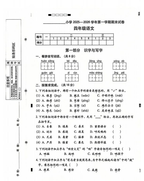 西城区小学四年级2025-2026学年度第一学期末语文试卷