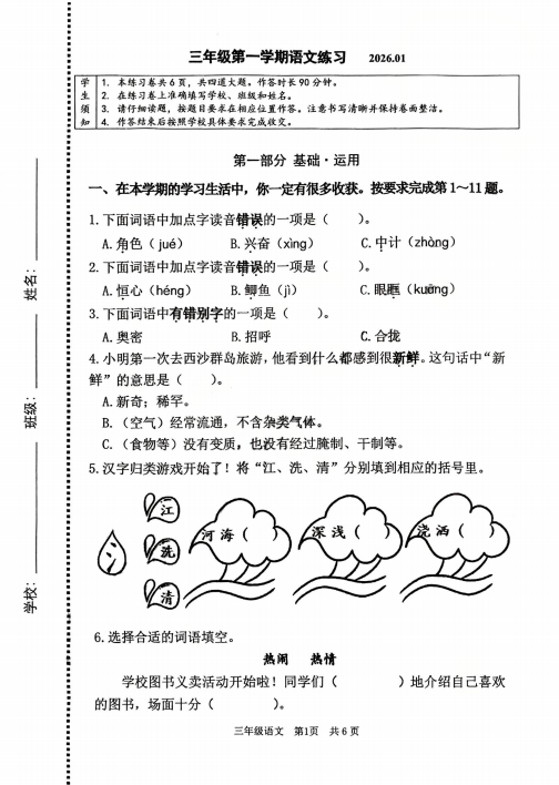 海淀区小学三年级2025-2026学年度第一学期末语文试卷