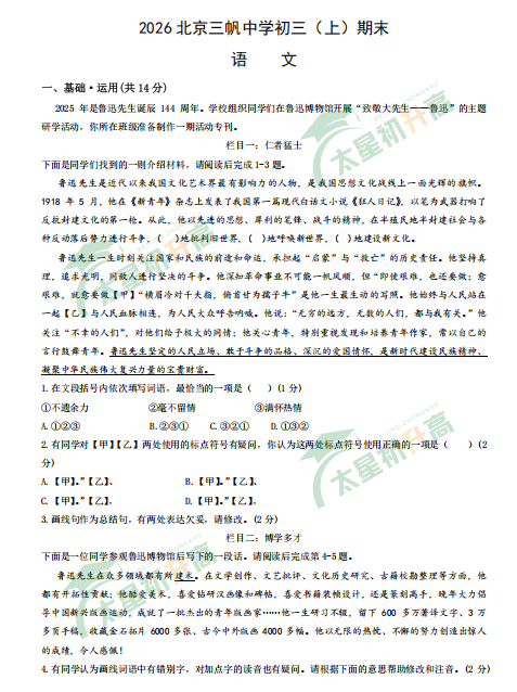 西城区北京三帆中学2025-2026学年度第一学期末初三语文试卷
