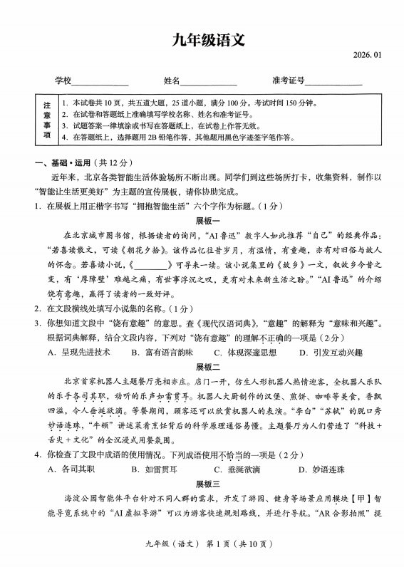 海淀区2025-2026学年度第一学期末初三语文试卷