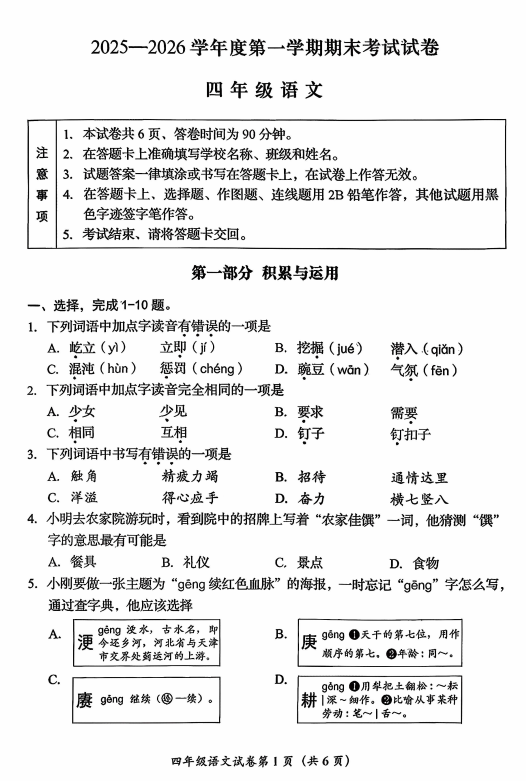 房山区小学四年级2025-2026学年度第一学期末语文试卷